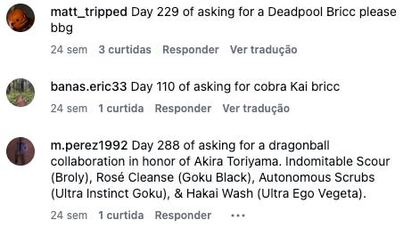 Um movimento interessante são os pedidos dos consumidores pelas novas collabs, estratégia recorrente da marca e que já fez parceria com Stranger Things, Trojan (marca de camisinha), Star Wars, Jurassic Park, Batman, Spiderman etc.